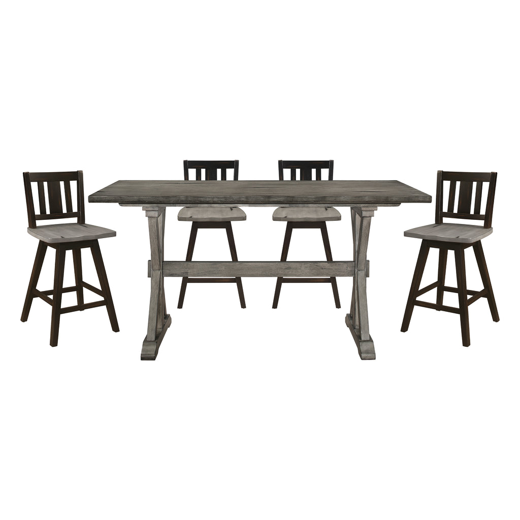 Creating a subtle rustic look is the design of the Amsonia Collection. A gray finish graces the solid rubberwood dining group highlighting the veneer. Providing visual interest beyond the classic styling, are the alternate finishes of the accompanying chairs, offered in black sand-though and white sand-through. The chairs also feature a swivel mechanism with three distinct seat backs – X-back, divided X-back and vertical slat back, lending to ease of motion while seated.