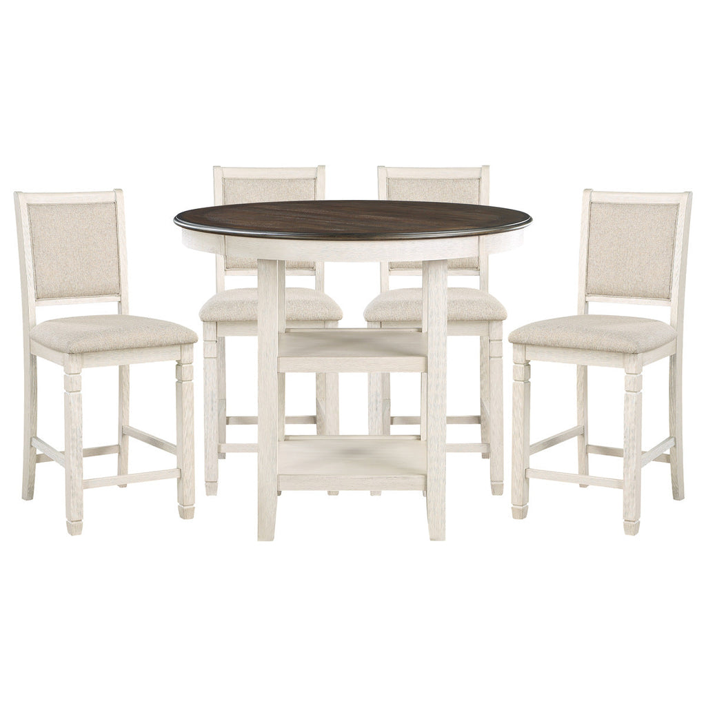 The transitional style of the Asher Collection creates a versatile platform to inspire your casual dining room décor. The round counter height table’s support base features a display shelf that allows for quick and open access to your tabletop accessories. The brown and black finish over acacia veneer serves to highlight the wood’s grain while allowing for maximum versatility in decorative accenting. The coordinating wood-framed counter height chairs feature beige fabric seats for complementing contrast.