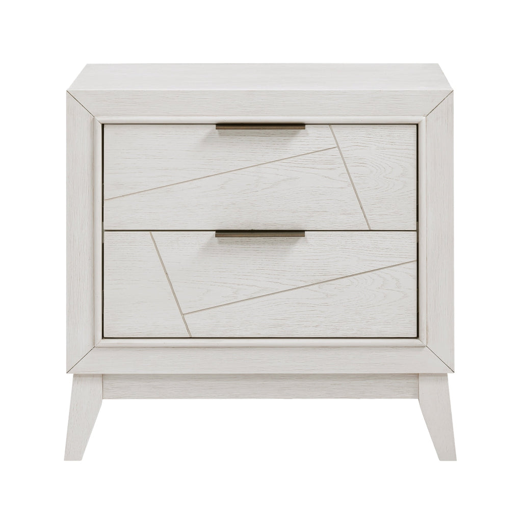 Bold geometrical styling is paired with unfettered modern lines to create the unique design of the Asteria Collection. An antique white finish highlights the collection’s oak veneer. Flat black finished metal bar hardware fronts the drawers of the nightstand. Asymmetrical routing fronts the drawer faces for dramatic accent to the collection.