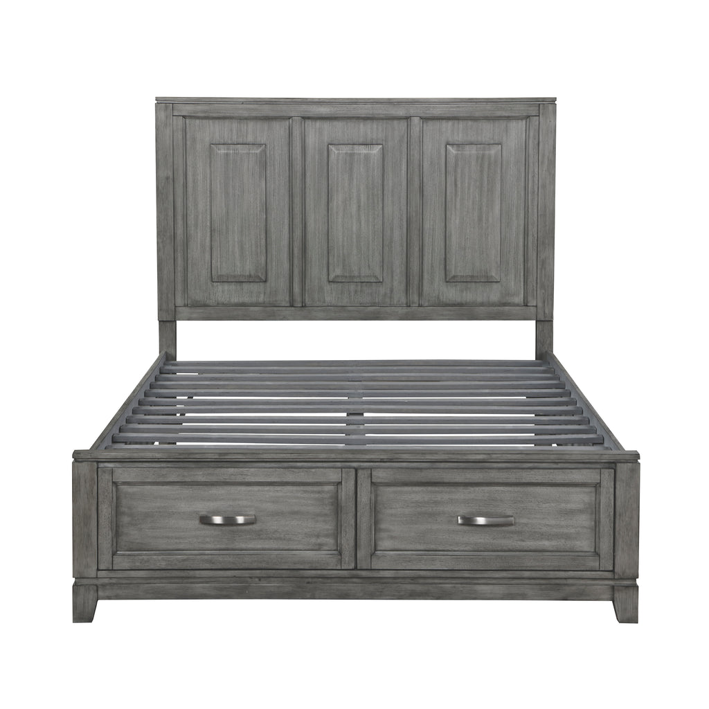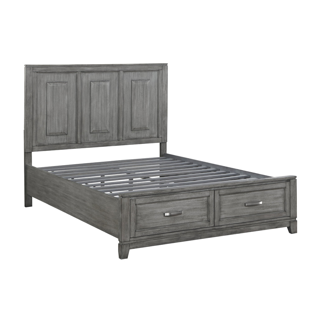The Garretson Collection blends transitional lines with rustic styling to create an elegant addition for your bedroom. The distinct grain of the okume veneer features a gray finish. The queen bed features metal bar hardware on the picture frame drawer fronts of the low-profile storage footboard, the two drawers creating additional space within your room for soft good storage.