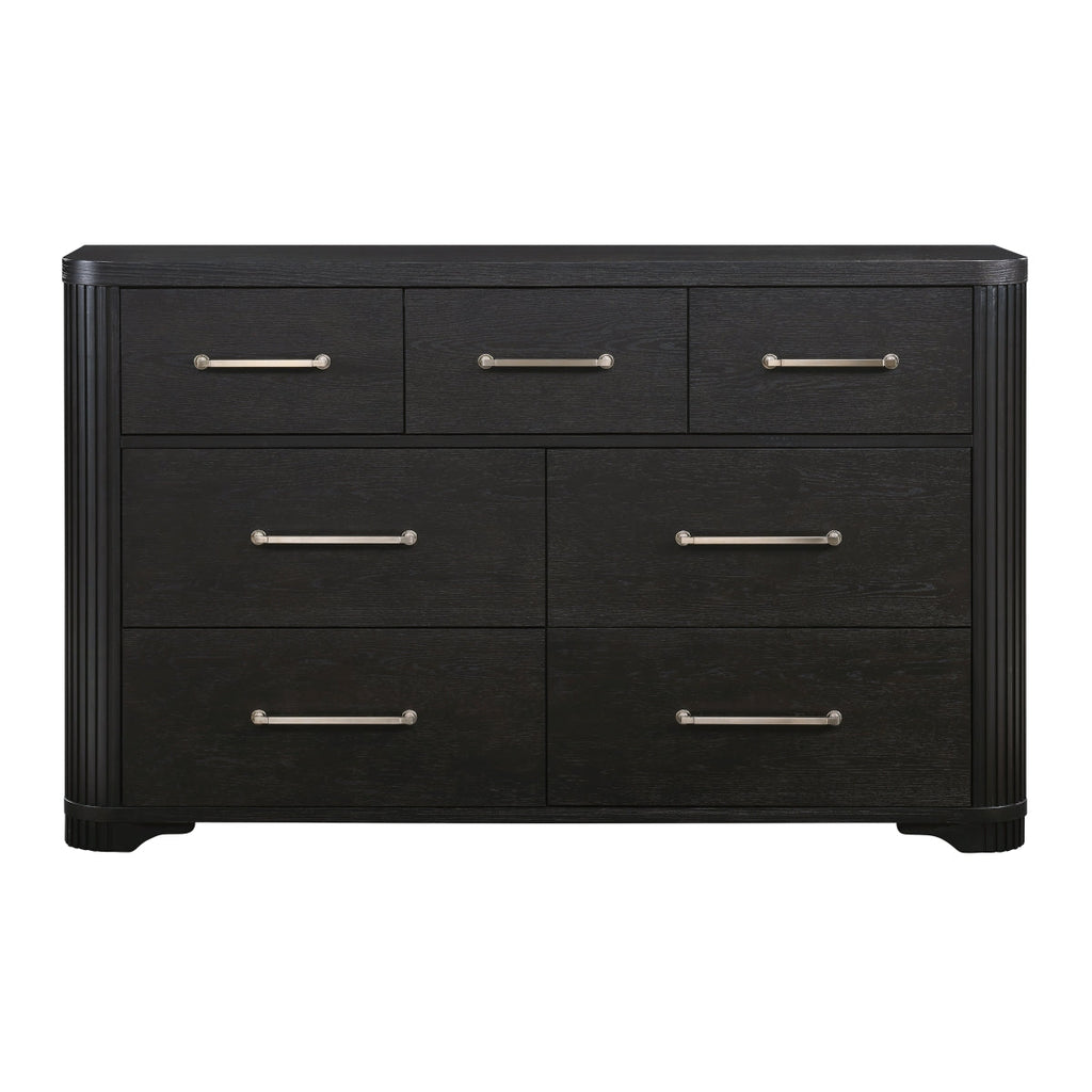 Elegant modern styling comprises the design of the Gilbert Collection while drawing subtle inspiration from the Art Deco movement. The oak veneer of the collection features a charcoal finish providing a rich hue to the distinct wood grain. Polished brass-tone bar pulls center each drawer of the dresser for complementing contrast.