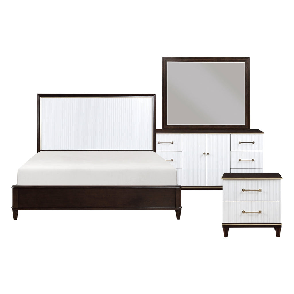 Tasked with executing a design that encompasses the trademarks of contemporary design while including hints at a glamorous lifestyle, the Niles Collection perfects the look. Brushed gold-tone knob and bar hardware radiate from the two-tone white and cherry finish of the collection, the dramatic combination creating an elegant statement of design perfection. Routed panels front the headboard, dresser, nightstand, and chest while gold-finished trim further accents the nightstand, and dresser. The low-profile footboard of the bed provides an unencumbered view of the panel headboard.