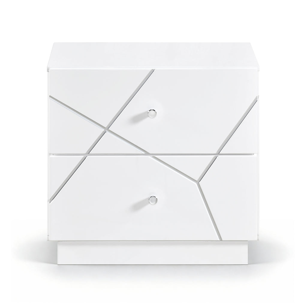 Complete your bedroom suite with this contemporary nightstand, the perfect companion to your bed. Constructed from a sturdy blend of wood and engineered wood, this piece is finished in a bright, clean white that brings a refreshing, modern look to any space. This piece features two spacious storage drawers, each accented with the same striking, etched geometric pattern found throughout the collection, adding texture and high-end visual flair. Functionality is ensured by smooth ball-bearing drawer glides for effortless access and sleek chrome-tone knobs that provide a sophisticated metallic contrast. This bedside table offers essential storage for books, remotes, and personal items, keeping your space tidy while serving as a chic display surface for a lamp or clock.