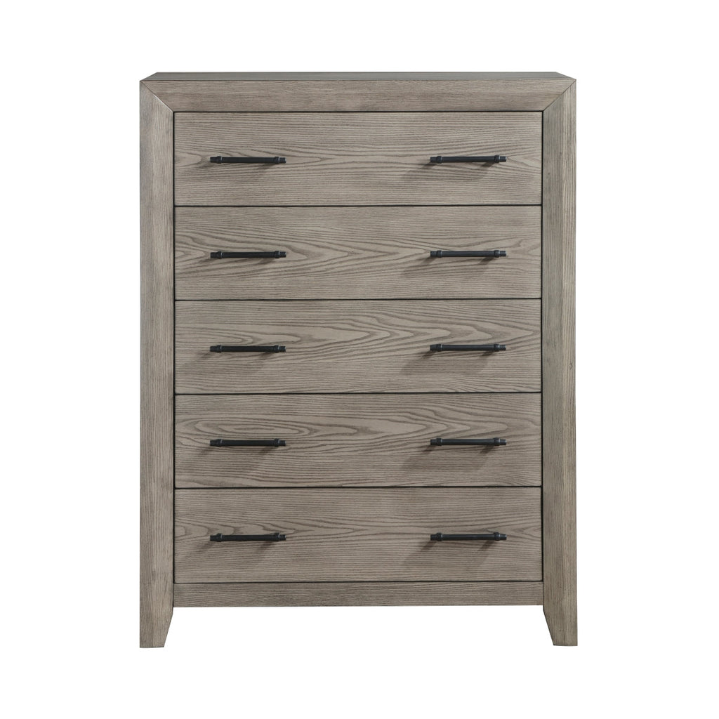 Bring a modern, rustic touch to your bedroom with this Silas Bedroom Collection. Crafted from durable acacia wood and selected hardwoods, the chest features beveled edges and dovetail drawers with ball bearing glides. The sleek gray finish enhances the natural wood grain while the matte black drawer pulls adds elegant touch, making this a versatile addition to any décor. Coordinating Queen bed, Eastern King and California King bed, nightstand, mirror and dresser are also available.