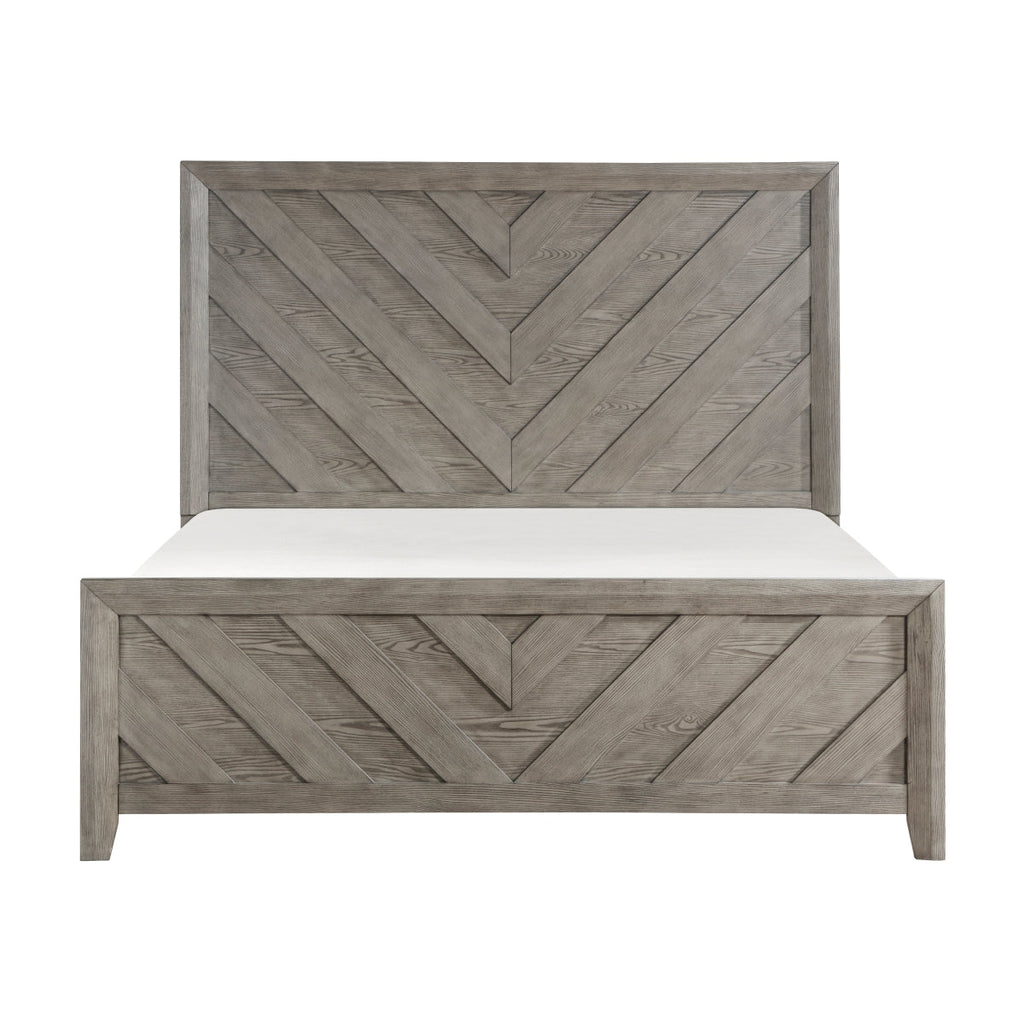 Bring a modern, rustic touch to your bedroom with this Silas Bedroom Collection. Crafted from durable acacia wood and selected hardwoods, the bed features a striking chevron design on the headboard and footboard, adding texture and character to your space. Available in Queen, Eastern King and California King. The sleek gray finish enhances the natural wood grain while the matte black drawer pulls on the coordinating pieces adds an elegant touch to any décor. Coordinating dresser, mirror, nighstand and chest are also available.