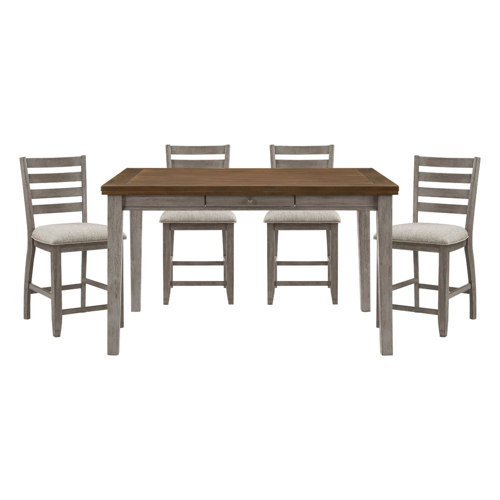 The traditional styling of the Tigard Collection lends timeless appeal to the look of your casual dining space. With subtle hints nodding to the Arts and Crafts design movement, the framed plank counter height tabletop, ladder back counter height chairs, and server each feature classic lines that solidify the versatile aesthetic of the collection. Covering the padded seats of the counter height side chairs is a neutral tone fabric upholstery, complementing the traditional cherry finish of the collection’s acacia veneer.