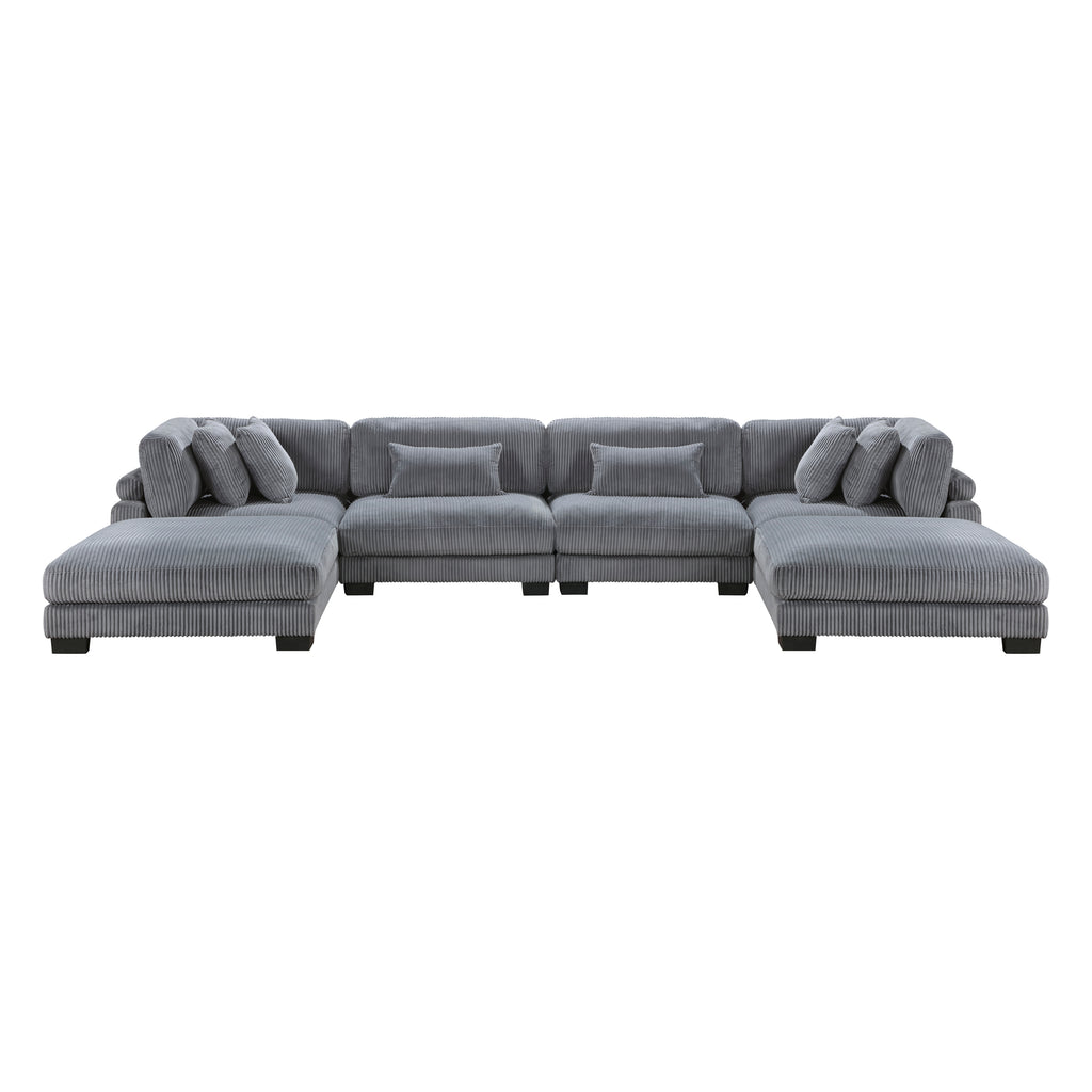 Configurable to your available space, the Traverse Collection allows for the addition and detachment of pieces for a customized seating experience. The 6-piece sectional configuration consists of two corner units paired with two armless chairs, and two ottoman. The plush beige corduroy fabric upholstery creates a plush expanse for a soft touch experience.