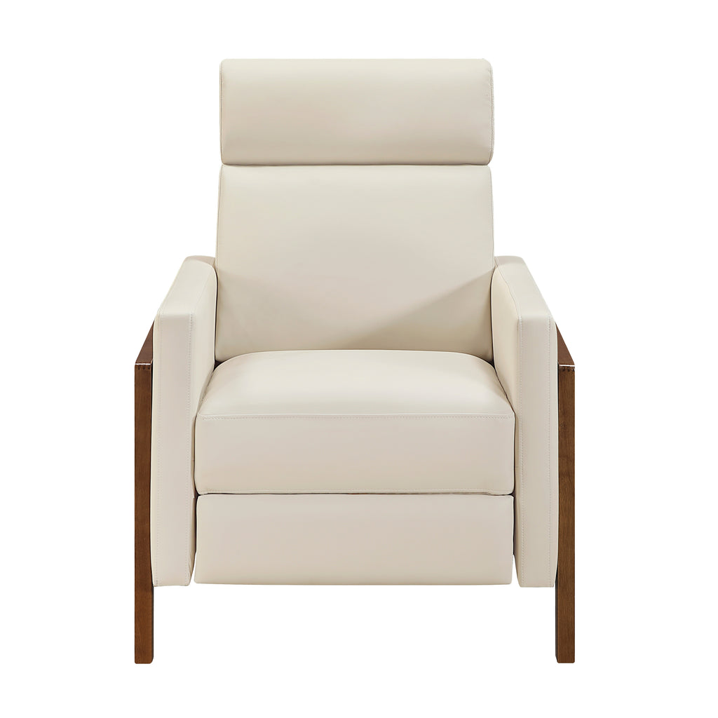 Elevate your living space with this stylish and functional push-back recliner, blending modern comfort with classic design. Upholstered in sleek faux leather, it provides a sophisticated, easy-to-clean surface. Supported by sturdy dark brown solid wood legs, the chair features a simple push-back or self-reclining motion, allowing you to effortlessly find your perfect position without buttons or levers.