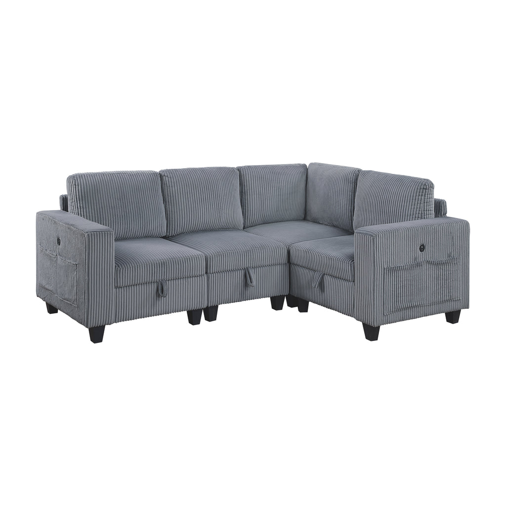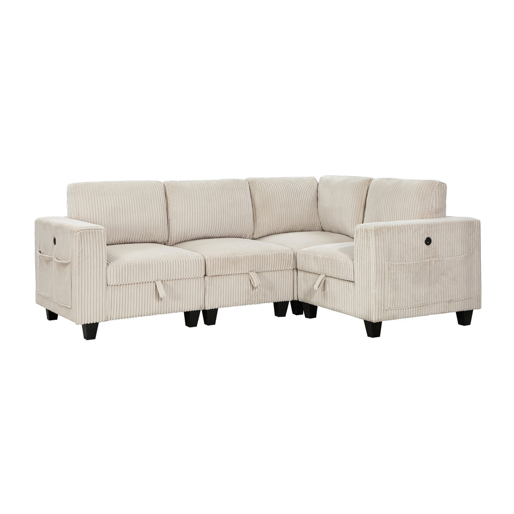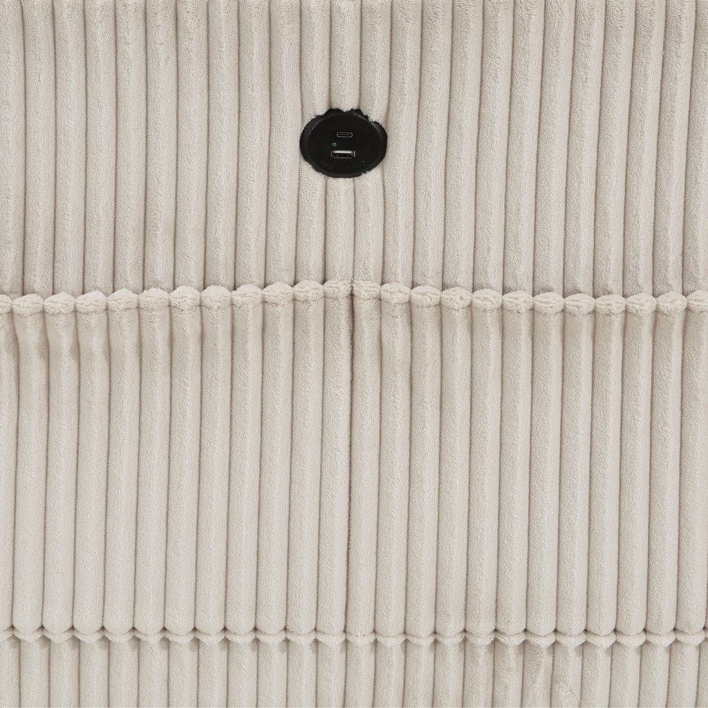 The multifunctional design of the Walterboro Collection creates a seating group that is not only configurable to your available space but serves as a convenient storage spot within your casual living room. Pull-out storage drawers are neatly tucked beneath the armless chair, and end seats of the sectional, each drawer easily accessible with a pull to the front-mounted loop handle. The corner seating unit of the sectional is anchored by one armless chair while the two end seat’s arms provide side support and power charging ports. The collection is covered in beige corduroy fabric for a neutral complement to your home’s décor.