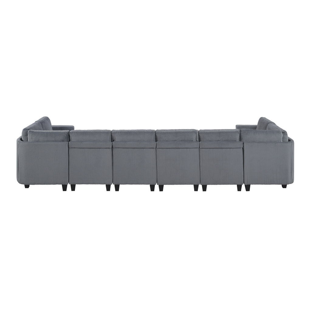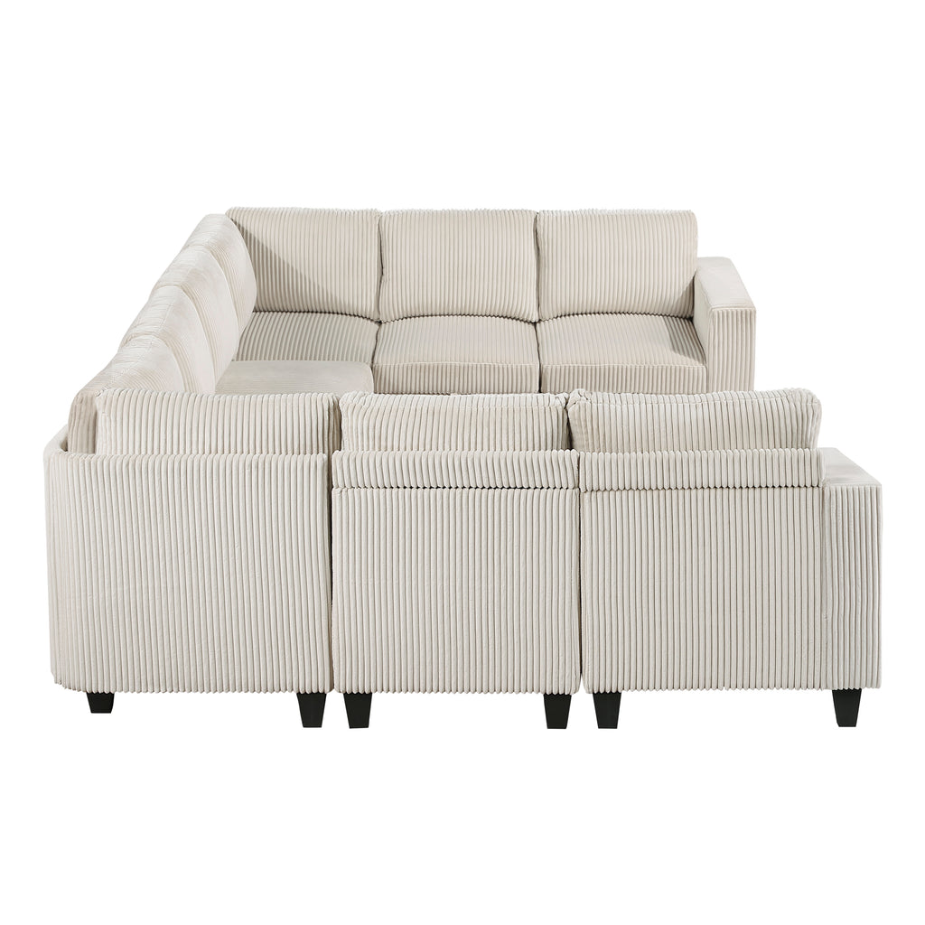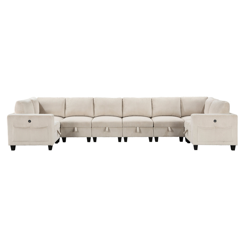 The multifunctional design of the Walterboro Collection creates a seating group that is not only configurable to your available space but serves as a convenient storage spot within your casual living room. Pull-out storage drawers are neatly tucked beneath the armless chairs, and end seats of the sectional, each drawer easily accessible with a pull to the front-mounted loop handle. The two corner seating units of the sectional bookend four armless chairs while two end seats arm's provide side support and power charging ports. The collection is covered in beige corduroy fabric for a neutral complement to your home’s décor.
